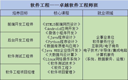 卓越工程师班是响应国务院办公厅深化产教融合指导思想,由校方联合知名企打造针对真实生产环境的任务式培养模式,让学生享受到更丰富、更优质的教学资源,实现学得好、用得上、好就业、就好业的办学目标。