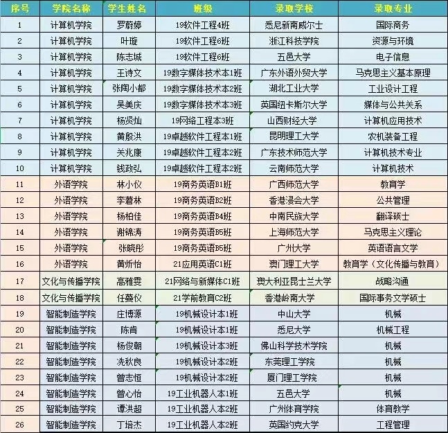 鼓励本科学生进一步深造,设有考研辅导培训和网上考研专栏,积极为学生提供贴心的服务。2023年大批毕业生考研成功,分别考入中山大学、上海师范大学、山西财经大学、广州大学、广东外语外贸大学、英国约克大学、英国纽卡斯尔大学、澳洲悉尼大学、澳大利亚昆士兰大学等国内外知名高校深造。